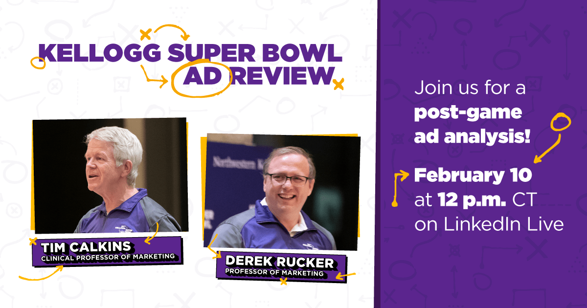 The Kellogg School Super Bowl Advertising Review panel comprises Kellogg Marketing Club students, led by two of Kellogg’s most widely recognized marketing professors, Tim Calkins and Derek Rucker.