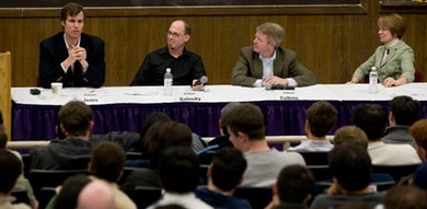 Ben Jones, Adam Galinsky and Tim Calkins debate the merits of ethanol during an April 3 event sponsored by the Kellogg Social Impact Club. Seated at far right is moderator Lynne Kiesling.