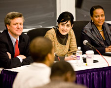 Panelists and students discussed the impact of the U.S. Presidential election during a Nov. 10 Kellogg event. Participants included, from left, Paul Christensen, senior finance lecturer and associate director of the Kellogg International Business and Markets Program; Victoria DeFrancesco Soto, Northwestern professor of political science and African-American studies; and Cheryl Mayberry McKissack ’89, CEO of Nia Enterprises. |